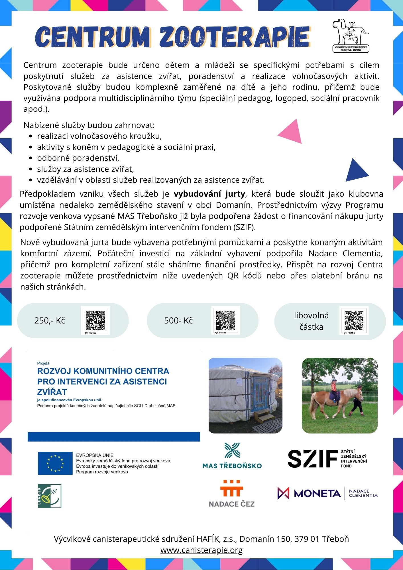 Na základě dlouhodobého zájmu o individuální práci s klientem ve spolku Hafík a zmapování vysoké poptávky po obdobných službách určených zejména pro děti a mládež se specifickými potřebami chceme dát možnost vzniku novému Centru zooterapie. Centrum bude určeno dětem a mládeži se specifickými potřebami s cílem poskytnutí služeb za asistence zvířat, poradenství a realizace volnočasových aktivit. Více informací a možnosti přispět na rozvoj Centra najdete zde.