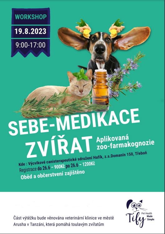Zveme Vás na workshop Sebe-medikace zvířat, aplikovaná zoo-farmakognozie, který se bude konat 19.8.2023 v zázemí naší haly v areálu bývalého Otavanu v Třeboni. Více podrobností najdete v našich akcích.