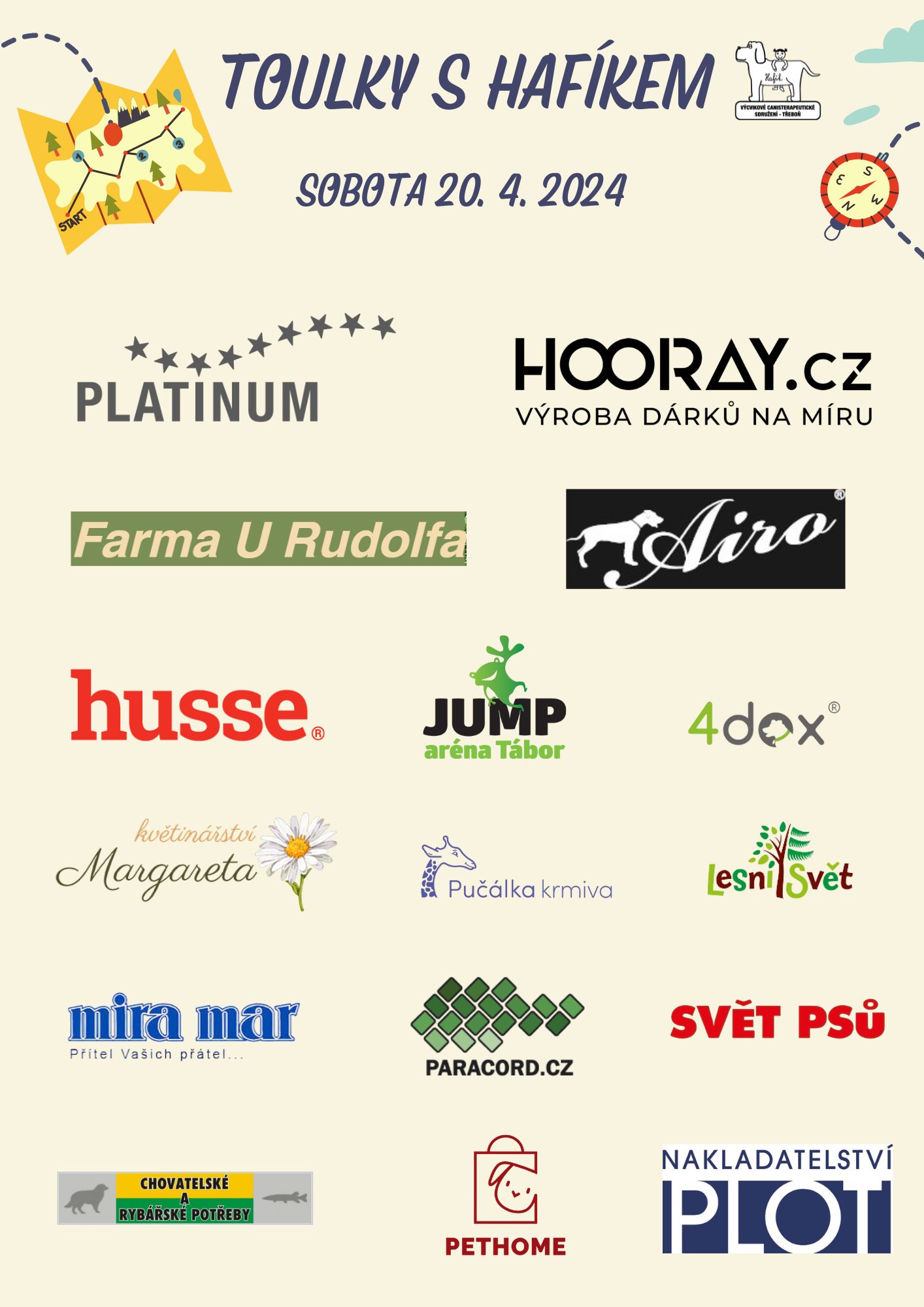 Termín naší oblíbené akce Toulky s Hafíkem je za dveřmi a my se velice těšíme na všechny přihlášené účastníky! Děkujeme všem sponzorům, kteří naší akci podpořili a díky nimž se může každý přihlášený těšit na drobný dárek. Děkujeme: Farma U Rudolfa, Lesní Svět, 4dox, Mira Mar CZ, pethome.cz, Svět psů, Jump aréna Tábor, Nakladatelství PLOT, Chovatelské a rybářské potřeby Třeboň, Husse, Airo, HOORAY.cz, Květinářství Margareta, Pučálka krmiva, PARACORD.CZ, a PLATINUM Natural.