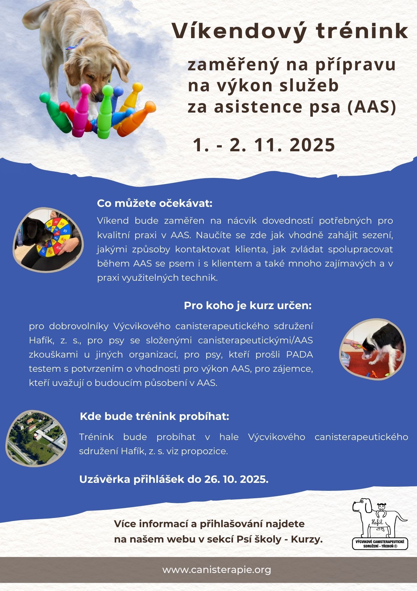 Chcete se dozvědět, jak na kvalitní praxi v AAS? Zajímá vás, jak správně navázat kontakt s klientem, zahájit vhodnou spolupráci s ním i se psem a jaké techniky využít v praxi? Přihlaste se na náš intenzivní víkendový trénink zaměřený na přípravu pro výkon AAS!