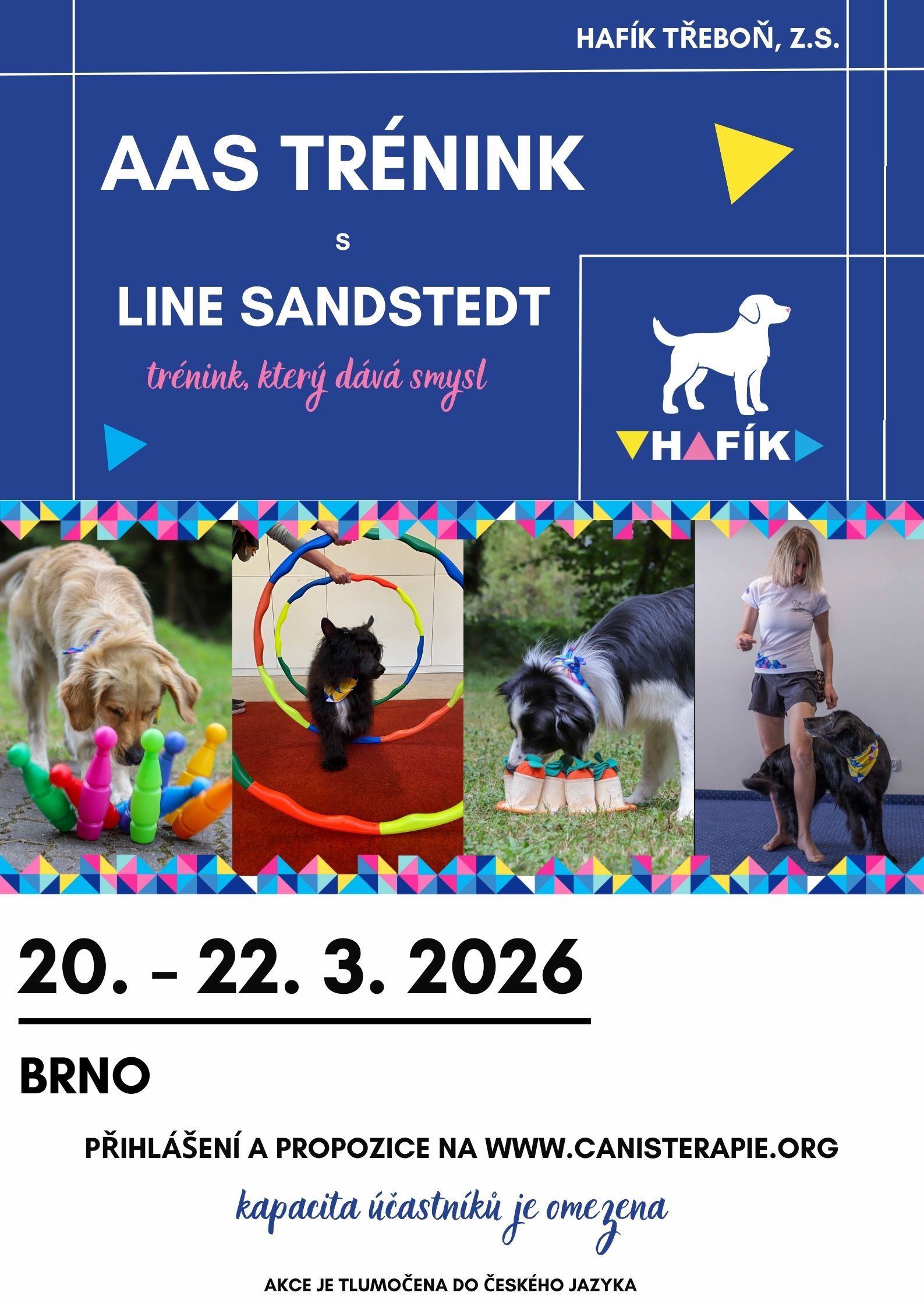 V sobotu 21. 3. 2026 a v neděli 22. 3. 2026 se budeme věnovat praktickým nácvikům jednotlivých dovedností potřebných a vhodných pro AAS. Trénink jednotlivých psů se bude vždy odvíjet od jejich stávajících dovedností, momentálního nastavení a zájmu jejich majitele. Necvičící účastníci budou pozorovateli a mohou být v případě potřeby a zájmu do některých aktivit prakticky zapojeni. Během tréninku budou moci klást otázky. Budeme probírat tréninkové techniky a využití trénovaných prvků v praxi.
